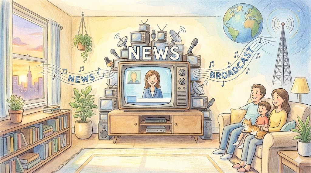 TV나 라디오를 통해 그날의 주요 사건이나 정보를 전달하는 프로그램을 말합니다. 아침 뉴스, 저녁 9시 뉴스처럼 정해진 시간에 하는 정규 방송을 주로 가리킵니다.