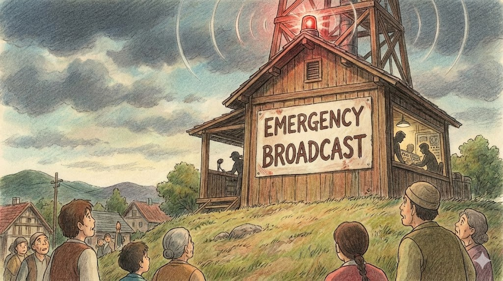 지진, 태풍, 전쟁 등 국가적인 위기 상황이나 재난이 발생했을 때, 정규 방송을 끊고 국민들에게 대피 요령이나 상황을 알리는 긴급 방송입니다. 삐- 하는 경고음과 함께 나옵니다.