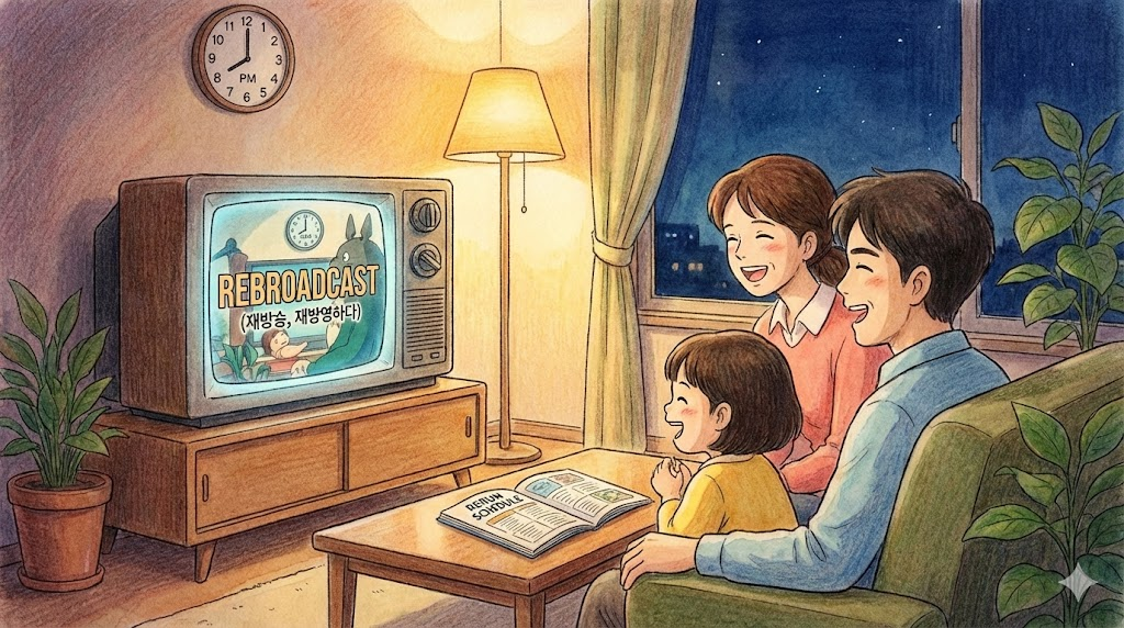 - 해석: 이미 방송된 프로그램을 다시 내보내는 것입니다. (Rerun과 유의어)
