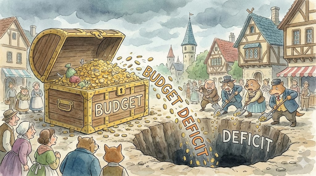 - 해석: 들어오는 수입보다 나가는 지출이 더 많아 돈이 모자란 상태입니다. (반대말: budget surplus)