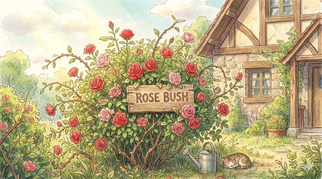 - 해석: 장미꽃이 피어 있는 관목입니다. 문학 작품이나 정원 묘사에 자주 등장합니다.
