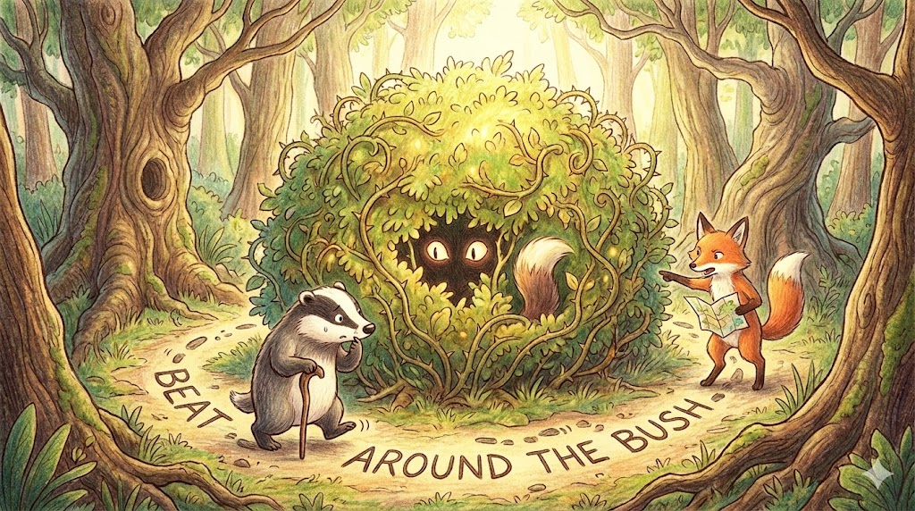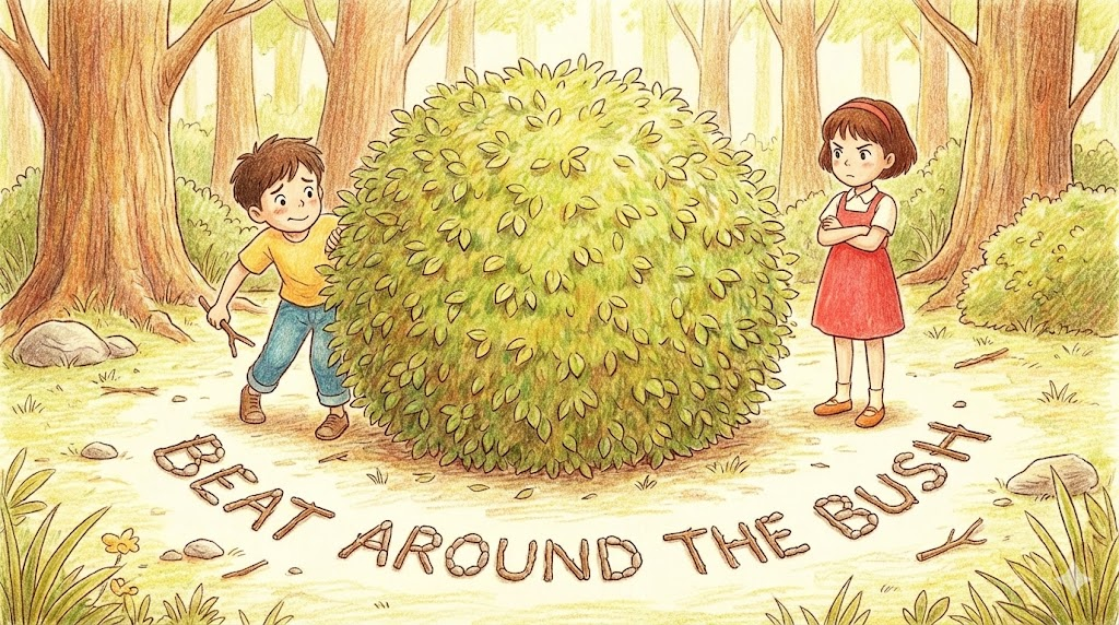 옛날에 사냥꾼들이 덤불(Bush) 속에 숨은 동물을 잡을 때, 직접 덤불을 치면 동물이 놀라 공격하거나 도망갈까 봐 덤불 주변(Around)만 두드리며 몰았던 것에서 유래했습니다. 하고 싶은 말을 직설적으로 하지 않고 시간만 끌거나 딴소리만 할 때 "빙빙 돌리지 말고 본론만 말해!"라는 뜻으로 씁니다.