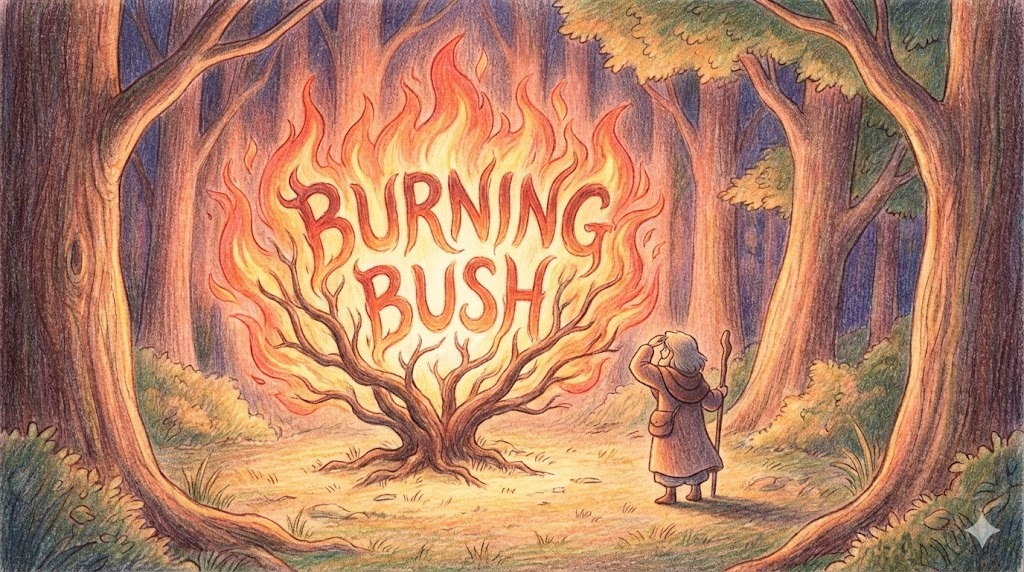 burning bush는 성경에서 모세가 신의 계시를 받을 때 보았던 '불타는 떨기나무'를 뜻하며, 기적이나 신성한 징조를 상징합니다.