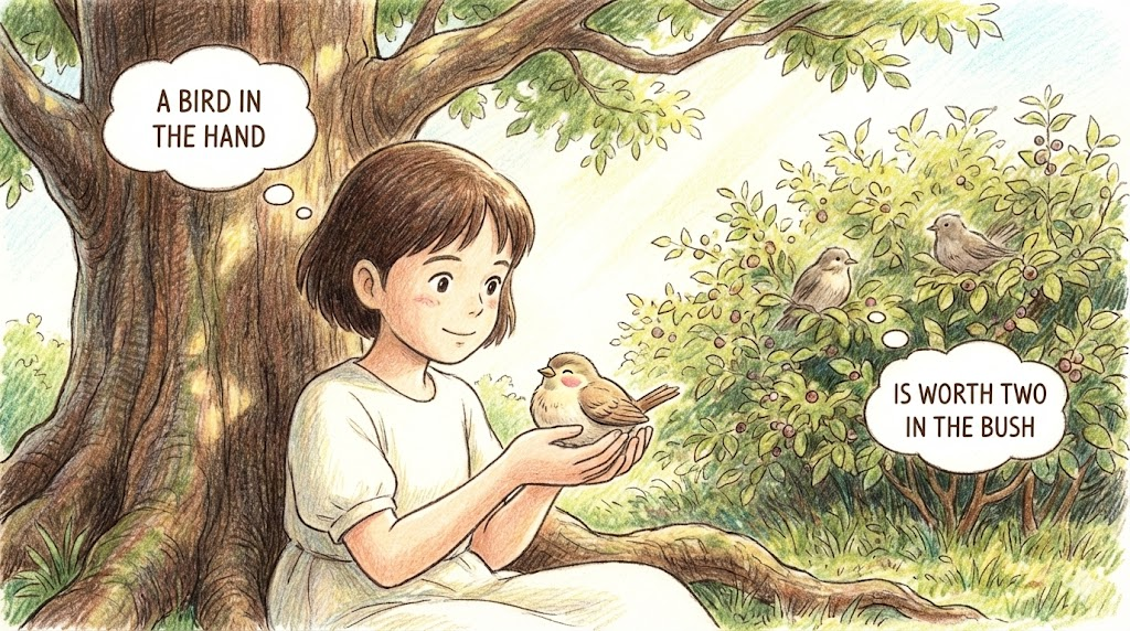 내 손안에 이미 잡은 새 한 마리가 숲속(Bush)에 있어서 잡을 수 있을지 없을지 모르는 두 마리보다 훨씬 가치 있다는 뜻입니다. 욕심부리다가 이미 가진 것마저 잃지 말고, 작더라도 현재 확실하게 확보한 이익에 만족하라는 교훈을 줍니다.
