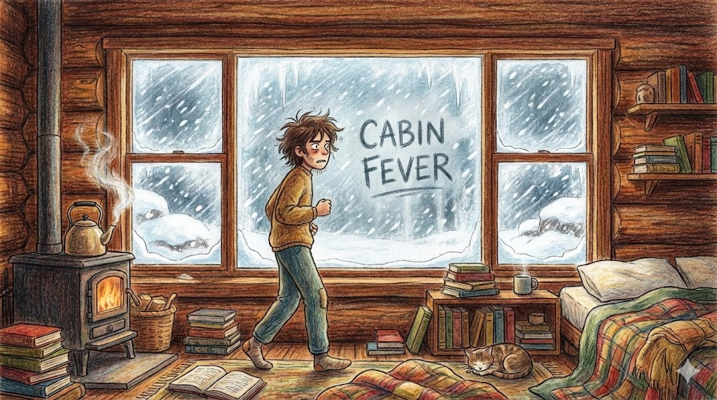 cabin fever는 오두막(cabin)에 갇혀 있을 때 생기는 열(fever)이라는 뜻으로, 오랫동안 실내나 좁은 공간에 갇혀 있어 생기는 '답답함', '불안', '짜증' 등의 심리적 상태를 말합니다(겨울철이나 격리 기간에 자주 씀).