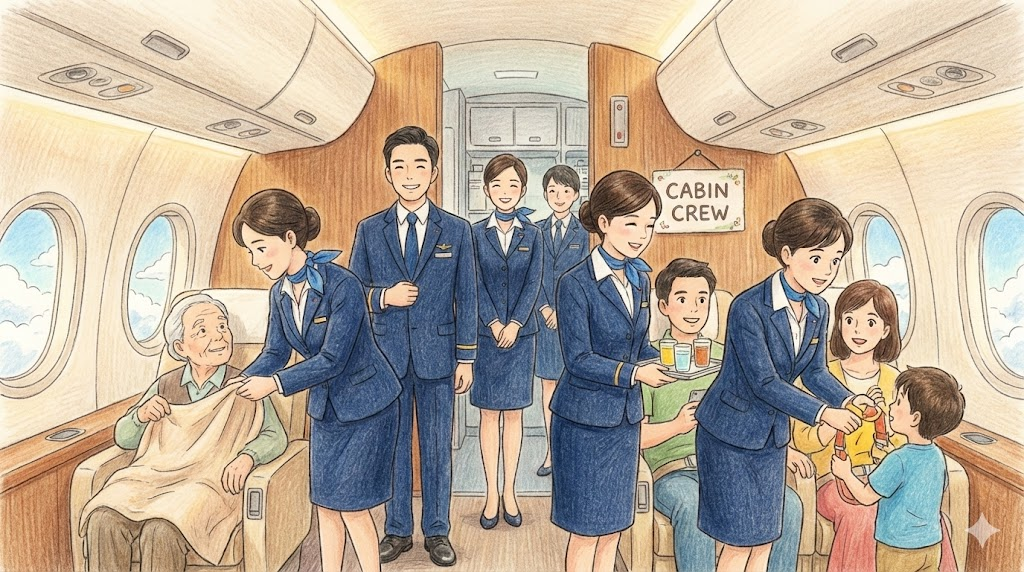 - 해석: 비행기에서 승객의 안전과 서비스를 담당하는 승무원들입니다. (Flight attendants)