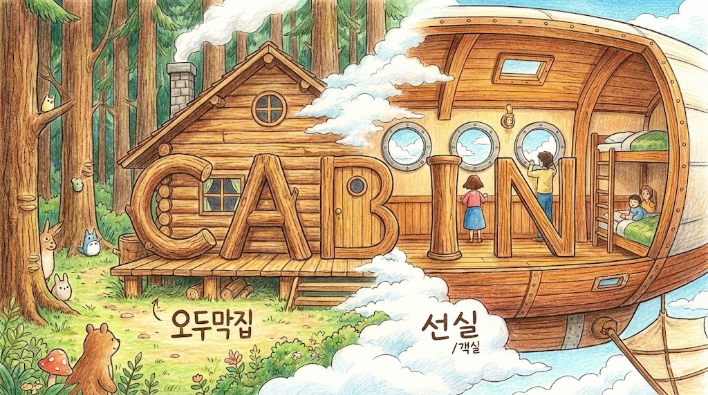'cabin'은 크게 세 가지 의미로 나뉩니다. 첫째는 통나무집 같은 "오두막", 둘째는 배의 "선실", 셋째는 비행기의 "객실"입니다. 자연 속의 휴식처부터 항공/선박 관련 지문까지 폭넓게 등장하는 단어입니다.