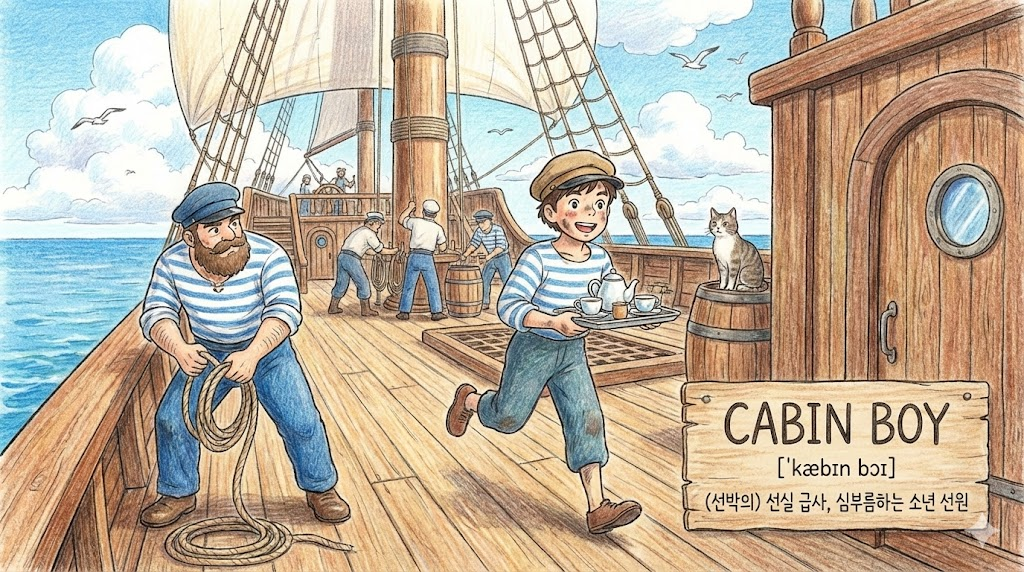 cabin boy는 과거 항해 시절 선장이나 승무원의 심부름을 하던 어린 '선실 급사(소년 선원)'를 뜻합니다.