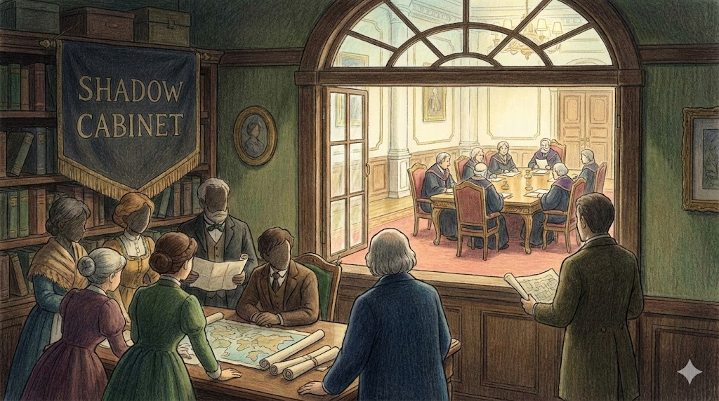 주로 영국식 정치 시스템에서 볼 수 있는 독특한 제도입니다. 야당(Opposition party)이 정권을 잡았을 때를 대비해서, 미리 "네가 국방부 장관 해, 네가 재무부 장관 해" 하고 짜놓은 예비 내각을 말합니다. 이들은 현 정부의 장관들을 1:1로 전담 마크(Shadow) 하며 비판하고 견제합니다.