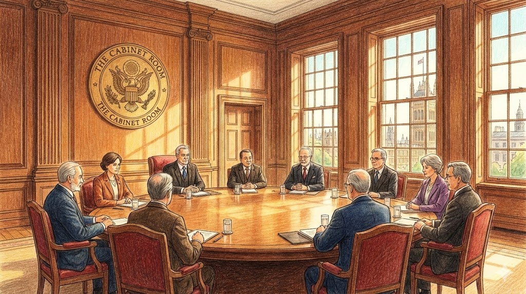 정부의 수반(대통령/총리)과 장관들이 모여서 나랏일을 의논하고 결정하는 공식적인 회의입니다. 국가의 중대사가 결정되는 자리입니다.