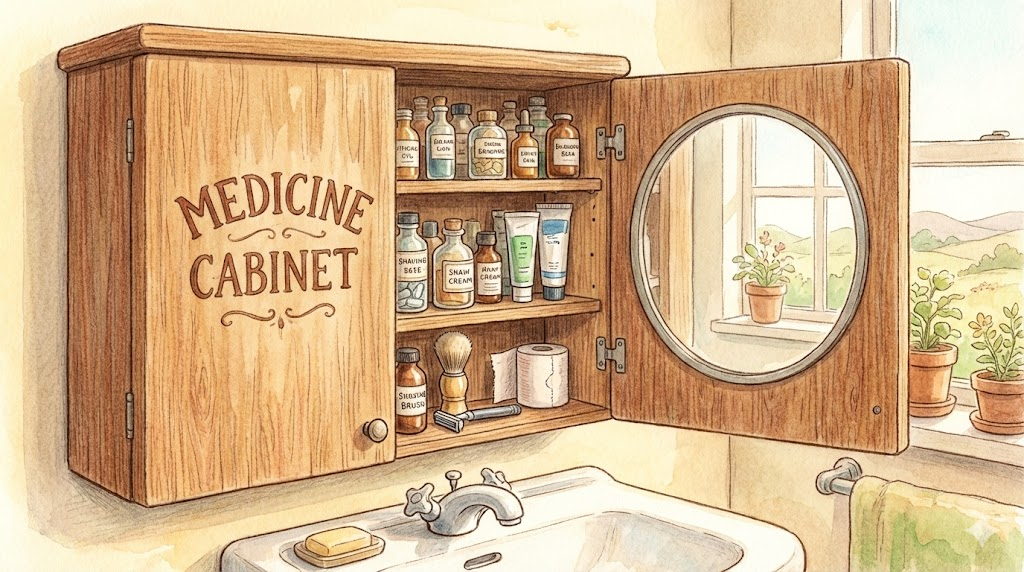- 해석: 주로 욕실 벽에 달려 있으며, 약이나 세면도구를 넣어두는 작은 수납장입니다.