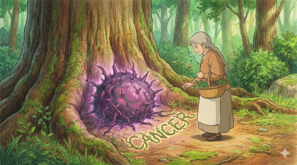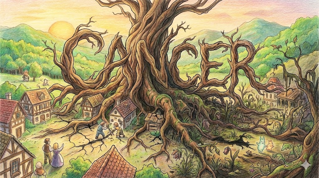 | 종합 뉘앙스 | (1) 세포가 게의 다리처럼 주변 조직을 파고들며 제멋대로 자라나는 병(암). (2) 사회 전체로 퍼져나가 망치는 악(병폐/독버섯). (3) 별자리 중 게 모양을 한 것(게자리). | '게처럼 파고드는 병' |