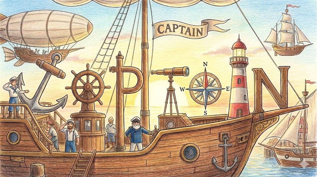 'captain'은 라틴어 'caput(머리/우두머리)'에서 유래한 단어로, 어떤 조직이나 탈것의 "우두머리", "선장", "기장", "주장" 을 뜻합니다. 군대에서는 "대위" 라는 계급을 나타내며, 비유적으로는 거대 기업을 이끄는 "거물" 을 의미하기도 합니다.