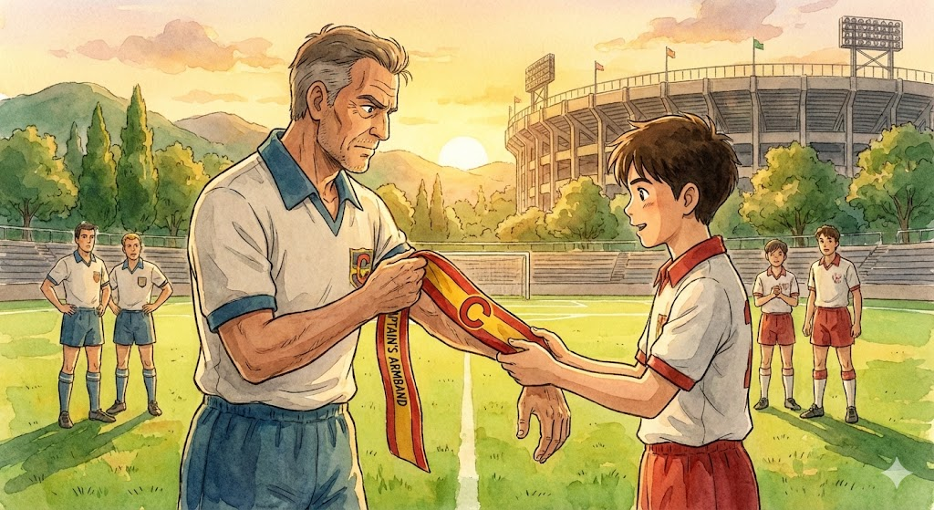 축구 경기에서 주장이 팔에 차는 띠를 말합니다. 리더십과 권위의 상징입니다. 경기 도중 주장이 교체되어 나갈 때, 이 완장을 풀어서 다음 리더에게 채워주는 장면은 팀의 리더십 승계를 보여주는 상징적인 순간입니다.