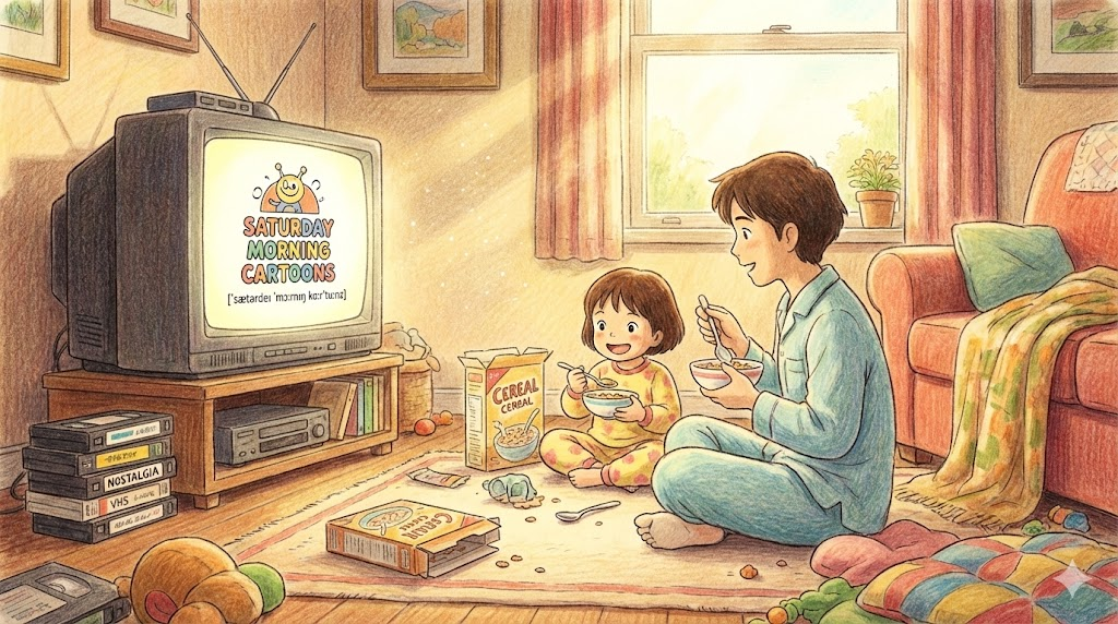 Saturday morning cartoons는 과거 미국에서 토요일 아침마다 방영되어 아이들이 챙겨 보던 'TV 만화 프로그램'을 뜻하며, 어린 시절의 향수를 자극하는 단어입니다.