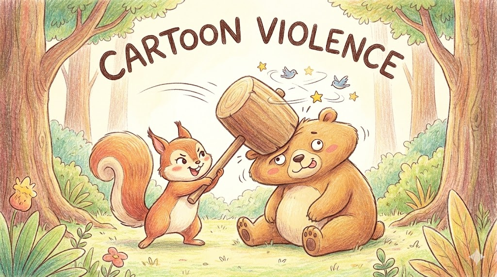 <톰과 제리>처럼 망치로 머리를 때리거나 절벽에서 떨어져도, 피가 나거나 죽지 않고 납작해졌다가 다시 원래대로 돌아오는 식의 비현실적인 폭력을 말합니다. 아이들이 보기에 심각하지 않고 웃음을 유발하는 슬랩스틱(Slapstick) 요소를 가리킵니다.