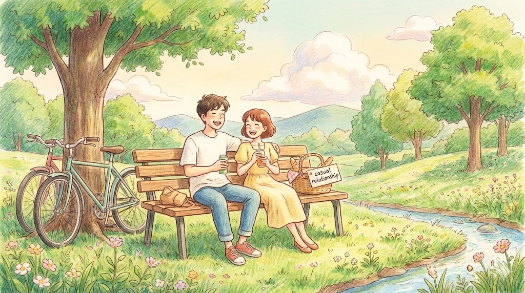 심각한 약속(Commitment)이나 결혼 같은 미래 계획 없이, 서로 즐거움을 위해 만나는 쿨한 남녀 관계를 말합니다. 구속받기 싫어하는 현대적인 연애 방식을 표현할 때 자주 씁니다.