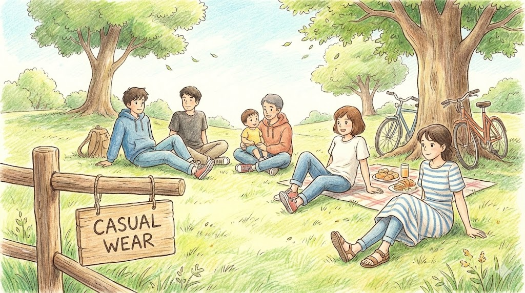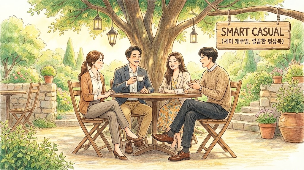 - 해석: 완전히 격식 없는 옷(반바지, 슬리퍼 등)은 아니지만, 정장보다는 편안하면서도 단정한 복장 규정(Dress code)입니다. 면접이나 비즈니스 미팅에서 자주 요구됩니다.