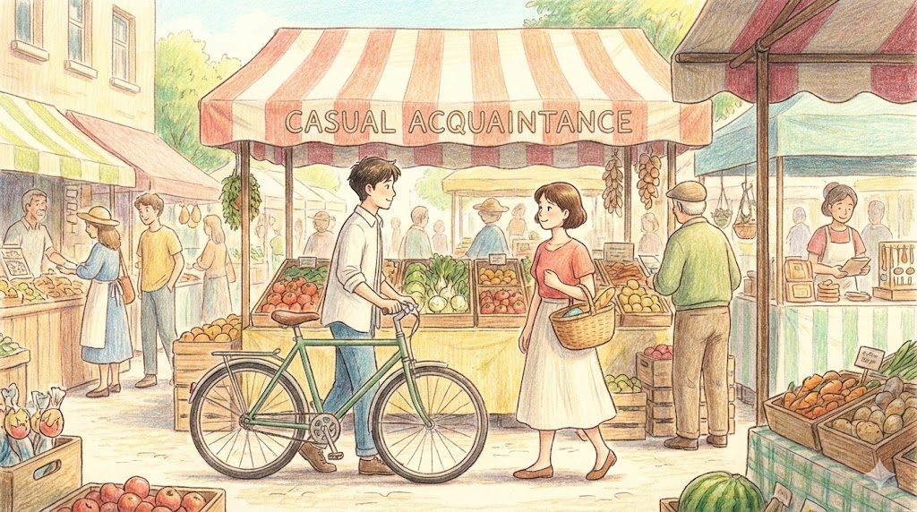 친구(Friend)라고 부르기엔 안 친하고, 모르는 사람(Stranger)은 아닌 어중간한 관계입니다. 이름 정도만 알고 만나면 가볍게 목례나 "안녕하세요" 정도만 하는 얕은 인맥을 뜻합니다.