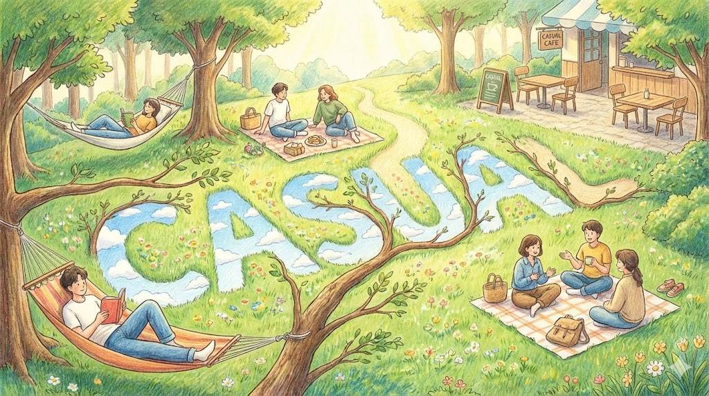 'casual'은 격식 없고 편안함을 뜻합니다. 옷차림에서는 'wear/smart casual'로, 관계나 태도에서는 'worker(임시직)', 'relationship(가벼운 만남)', 'remark(무심한 말)' 등으로 쓰여 깊이나 구속이 없음을 나타냅니다.