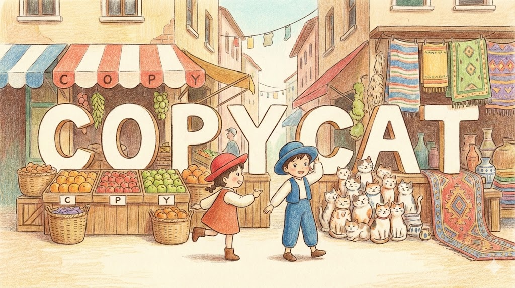 copycat은 남의 행동이나 작품을 그대로 따라 하는 '모방범' 또는 '따라쟁이'입니다 (아이들이 놀릴 때 자주 씀).