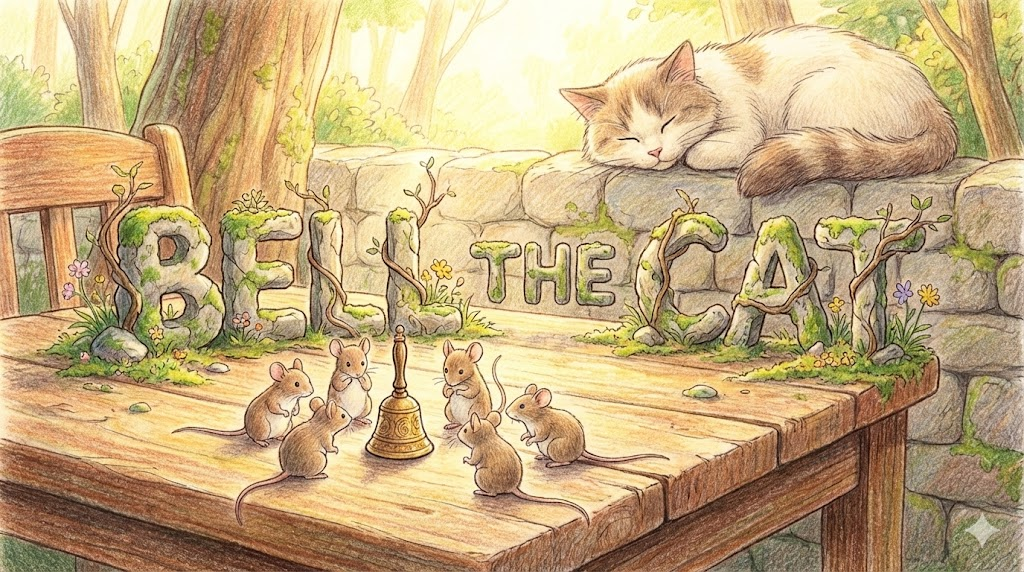 이솝 우화에서 쥐들이 고양이가 오는 걸 알기 위해 고양이 목에 방울을 달자고 회의했지만, 정작 "누가 가서 달 건데?"라고 했을 때 아무도 나서지 않았다는 이야기에서 유래했습니다. 계획은 좋지만 실행하기 매우 위험하거나 어려운 일을 누가 할지 정할 때 씁니다.