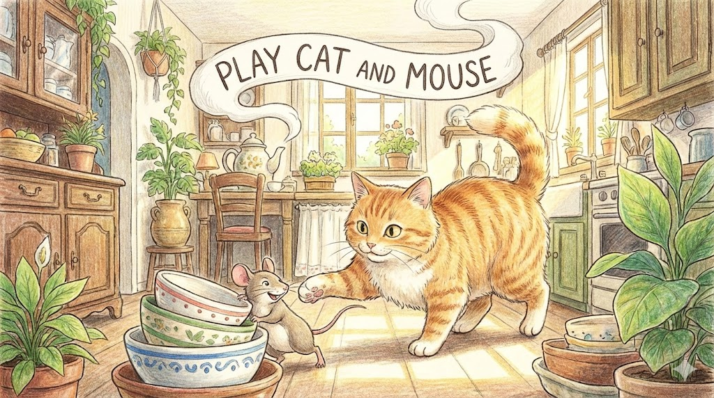 고양이가 쥐를 잡기 전에 바로 죽이지 않고 잡았다 놓아줬다 하며 가지고 노는 잔인한 장난에서 유래했습니다. 경찰과 범인, 혹은 연인 사이에서 서로 쫓고 쫓기거나, 상대를 마음대로 조종하려 하며 밀당하는 긴장감 넘치는 상황을 묘사합니다.