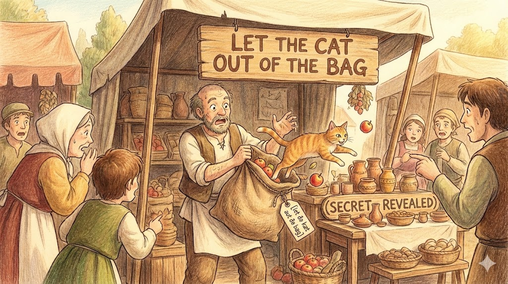 - 해석: 옛날에 시장에서 비싼 돼지 대신 고양이를 자루에 넣어 속여 팔던 사기꾼의 자루를 열면 고양이가 튀어나와 사기가 들통난다는 데서 유래했습니다. 무심코 비밀을 말해버릴 때 씁니다. (Spill the beans와 유의어)