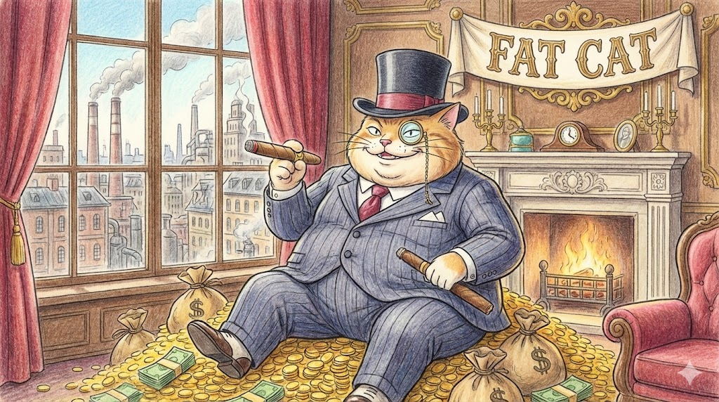 살이 뒤룩뒤룩 찐 고양이처럼, 일은 안 하고 돈과 권력만 잔뜩 쥐고 있는 부유한 기업가나 정치 후원자를 비판적으로 부르는 말입니다. 주로 월가(Wall Street)의 금융가나 대기업 임원들이 보너스 잔치를 벌일 때 비꼬는 말로 씁니다.
