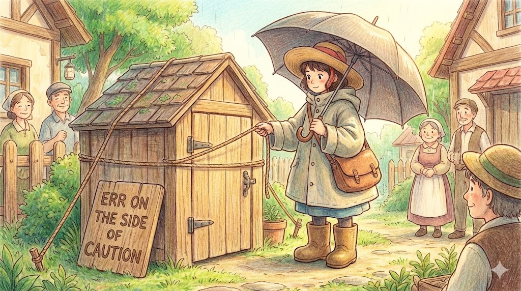 - It might not rain, but let's err on the side of caution and bring umbrellas. (비가 안 올 수도 있지만, 만약을 위해 안전하게 우산을 챙겨 가자.)