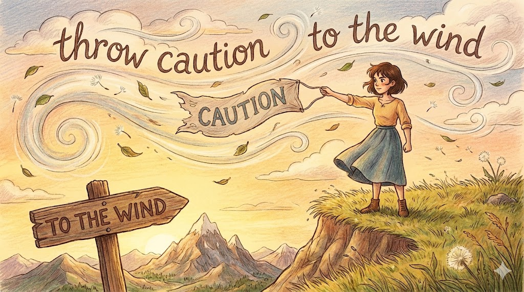 손에 쥐고 있던 '조심성(Caution)'을 바람에 날려 보낸다는 뜻입니다. 결과가 어떻게 되든 걱정하거나 망설이지 않고, 과감하고 대담하게(때로는 무모하게) 행동할 때 씁니다.