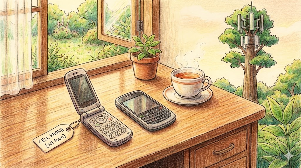 - 해석: 기지국(cell)을 통해 통신하는 전화기입니다. (Cellular phone의 줄임말)