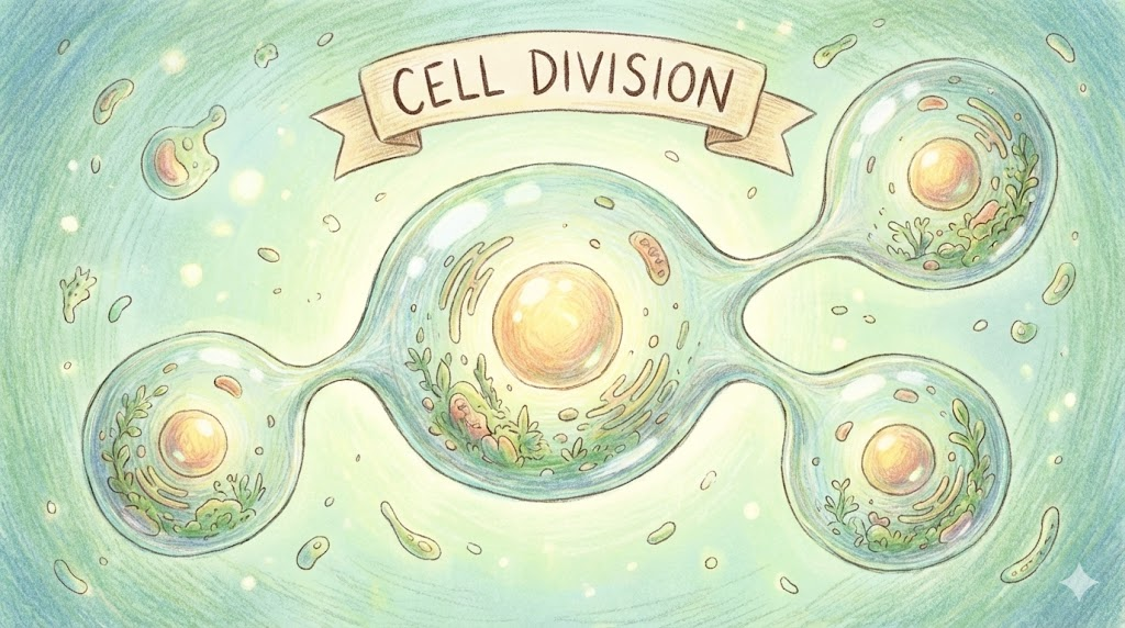 - 해석: 하나의 세포가 둘 이상으로 나뉘는 생물학적 과정입니다. (Mitosis: 체세포 분열 / Meiosis: 감수 분열)