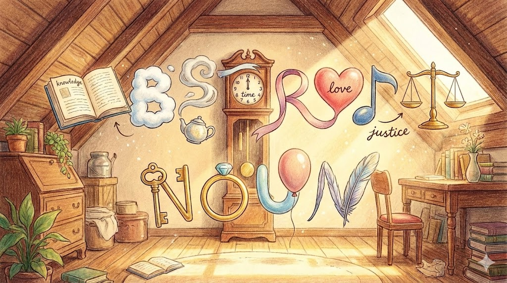 - 해석: 사랑(love), 평화(peace), 행복(happiness)처럼 눈에 보이거나 만질 수 없는 개념을 나타내는 명사입니다.