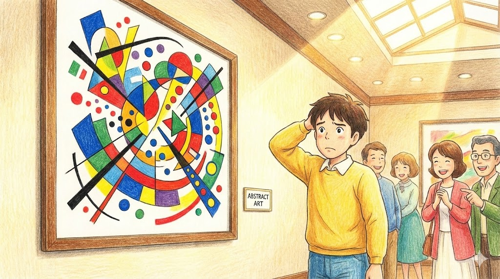 - 해석: 사물을 있는 그대로 사실적으로 그리는 것이 아니라, 점, 선, 면, 색채 등으로 작가의 감정이나 생각을 표현하는 미술 사조입니다. (반대말: Figurative art - 구상 미술)