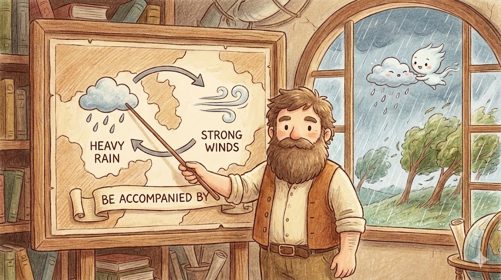 - Strong winds were accompanied by heavy rain. (강한 바람이 폭우를 동반했다(폭우와 함께 나타났다).)