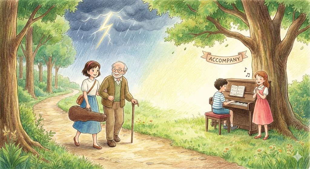 예체능 관련 지문이나 일화(Storytelling) 지문에서 'accompany'가 나오면 '따라가다'가 아니라 "반주하다(Play music for)" 로 해석해야 자연스러운 경우가 많습니다. 이때 연주자는 Accompanist(반주자) 라고 부릅니다.