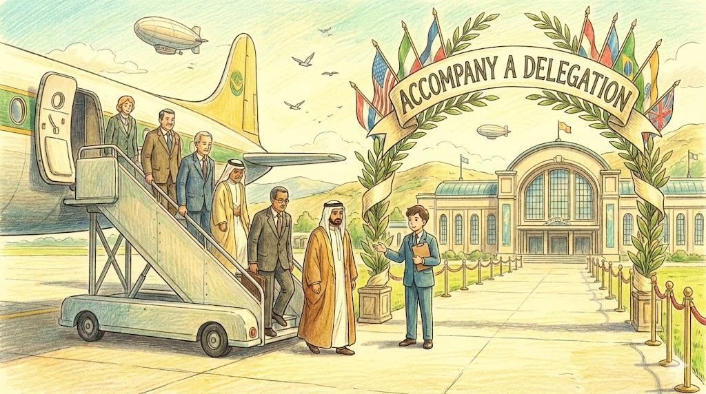 단순히 같이 여행 가는 것이 아니라, 공적인 임무를 띠고 높으신 분들이나 대표 그룹(Delegation)을 모시고 간다는 뜻입니다. 외교, 비즈니스 출장 등에서 안내하거나 보좌하는 역할을 강조합니다.