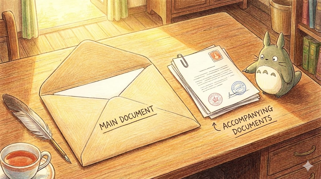 비즈니스나 공식적인 업무에서 메일, 신청서, 소포 등을 보낼 때 본 문서와 세트로 딸려 가는 설명서나 증빙 서류를 말합니다. 단순히 같이 있는 종이가 아니라, 본 내용을 보충하거나 증명하기 위해 꼭 필요한 '짝꿍' 문서라는 느낌입니다.