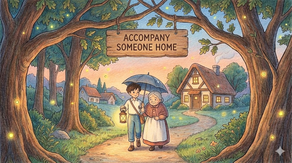 - 해석: 누군가가 집에 가는 길에 친구나 보호자로서 같이 가주는 것입니다.