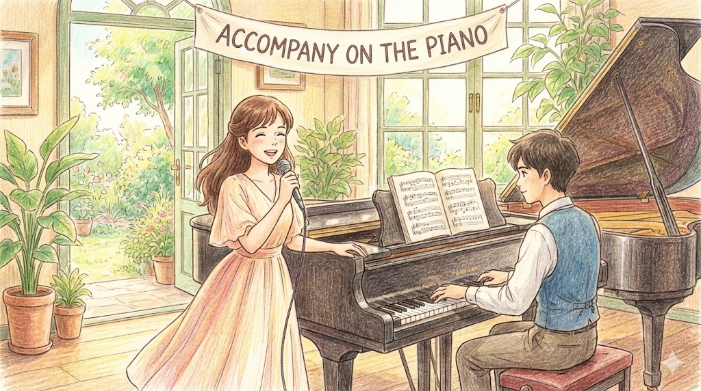 3. accompany on the piano (피아노로 반주하다)