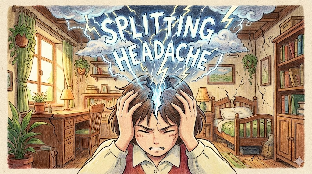 - 해석: 머리가 쪼개질(split) 것처럼 심한 두통을 강조하는 표현입니다.