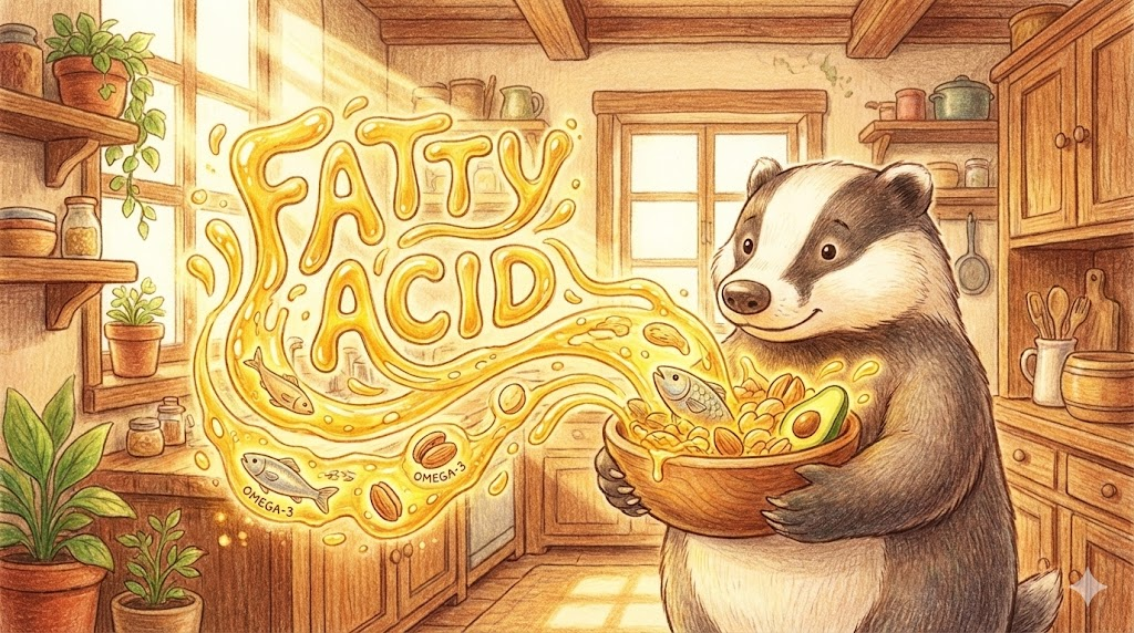 건강이나 영양학 관련 지문에서 자주 봅니다. 우리 몸에 에너지를 주고 세포를 구성하는 중요한 영양소입니다. 특히 '오메가-3' 같은 '필수 지방산(Essential fatty acids)'은 몸에 좋은 지방으로 자주 소개됩니다.
