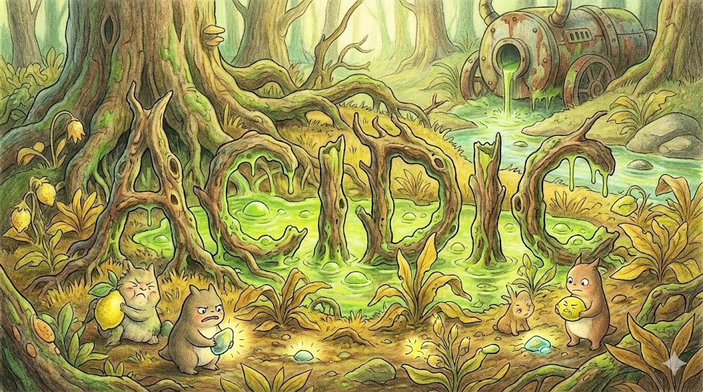 명사 'Acid'의 형용사형입니다. pH가 7보다 낮을 때(산성일 때) 쓰거나, 맛이 아주 실 때 씁니다. 흙이 산성이라 식물이 안 자란다거나, 몸이 산성 체질로 변했다는 등의 맥락에서 자주 쓰입니다. 반대말은 'Alkaline(알칼리성의)'입니다.