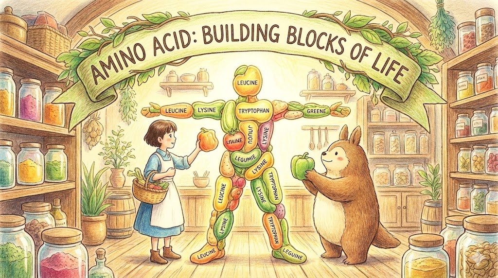 - 해석: 단백질을 구성하는 기본 단위입니다. 생물/화학 지문에서 필수 어휘입니다. (Essential amino acids: 필수 아미노산)