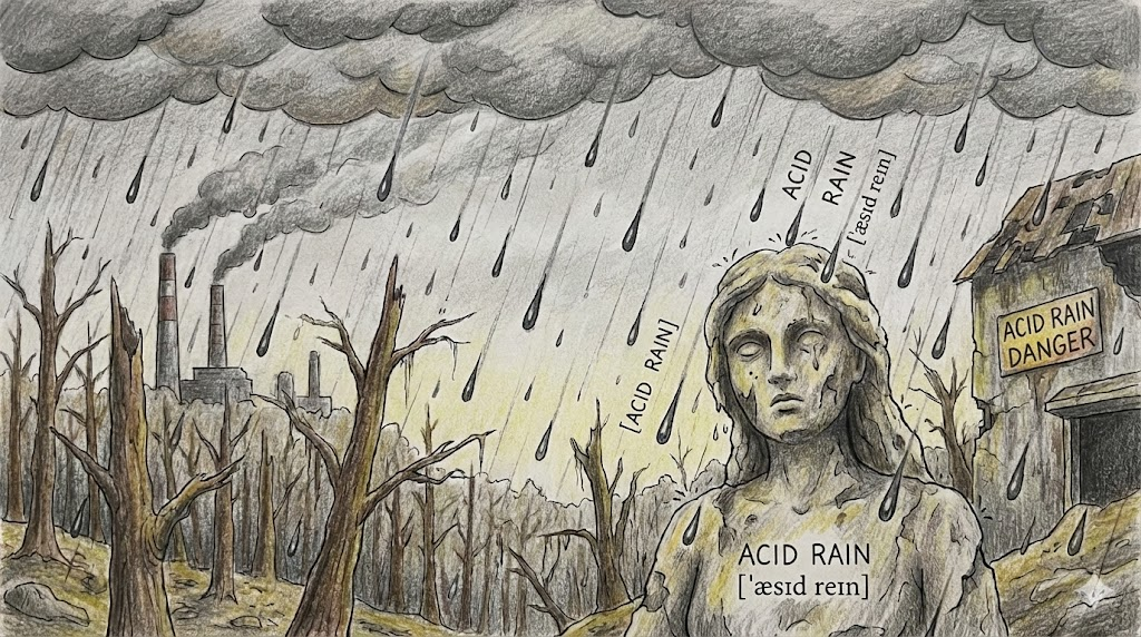 - 해석: 공장 매연 등의 오염 물질이 섞여 산성화된 비로, 환경 파괴의 주범입니다.