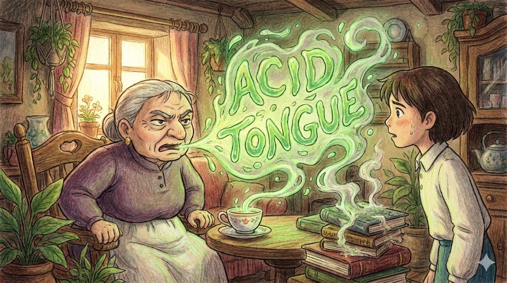 혀에 산(Acid)이 묻어 있어서 뱉는 말마다 남을 쏘고 상처 입힌다는 뜻입니다. 성격이 까칠하고 남을 비꼬거나 비판하기 좋아하는 사람을 묘사할 때 씁니다. 'Sharp tongue'과 비슷한 표현입니다.