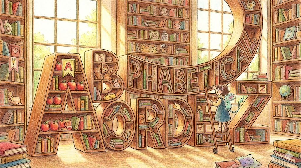 문자 체계와 정렬. 글자들의 집합, 정렬 기준(A-Z), 암기 및 학습 과정.