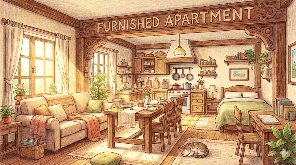 furnished apartment [ˈfɜːrnɪʃt əˈpɑːrtmənt]