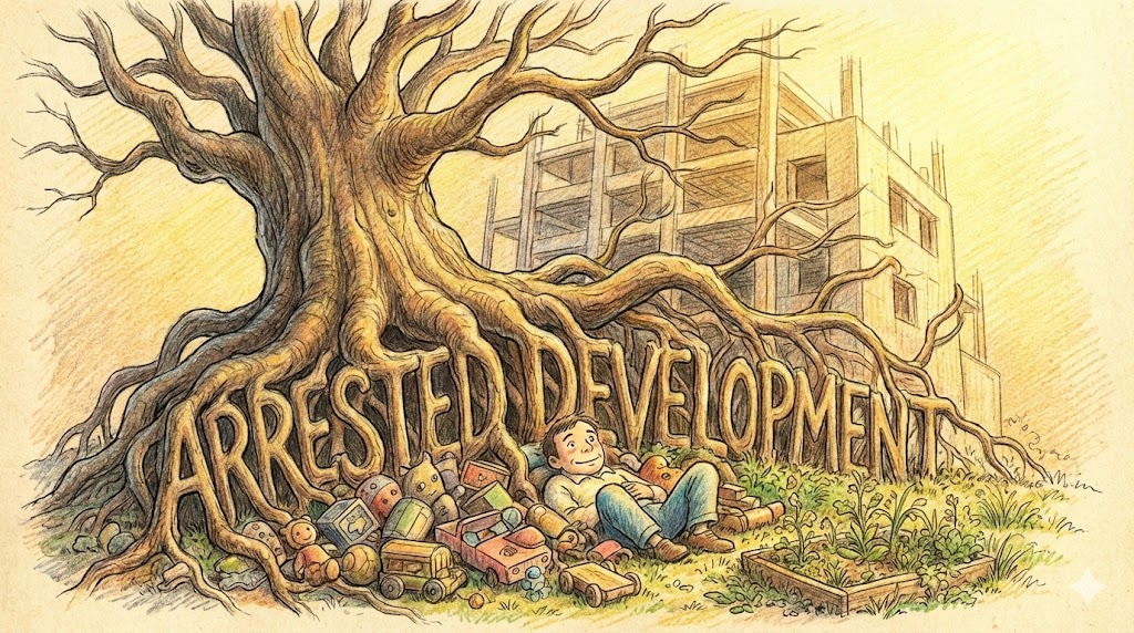 arrest development는 성장이나 발달이 멈춘 상태, 즉 '발달 정지'를 뜻합니다. (유명한 미드 제목 'Arrested Development'는 성장이 멈춘 철없는 어른들을 의미)
